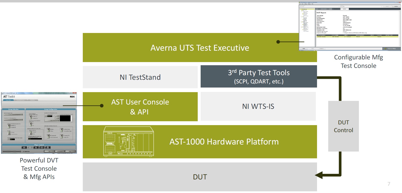 AST-1000 測試平台架構整合了 Averna UTS 測試執行工具、NI TestStand、第三方測試工具(如 SCPI、QDART)和 AST 使用者控制台與 API,提供強大的硬體平台與可配置的製造測試控制台;此架構支援待測裝置(DUT)的全面測試與控制,適用於設計驗證測試(DVT)和製造應用程式介面(Mfg APIs)。