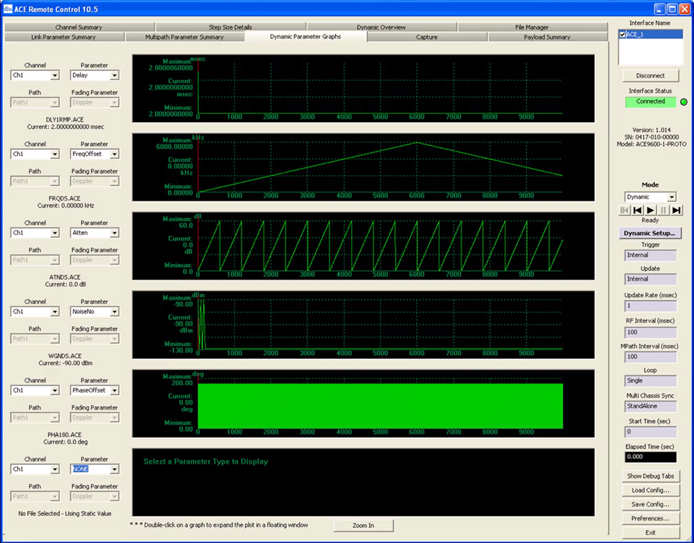 圖四、ACE Remote Control 的動態參數圖形 (Dynamic Parameter Graphs) 介面,用於監測 延遲、頻率偏移、衰減、雜訊功率、相位偏移 等通道參數變化。使用者可透過動態模式與內部觸發調整測試條件,支援單次或循環模式。