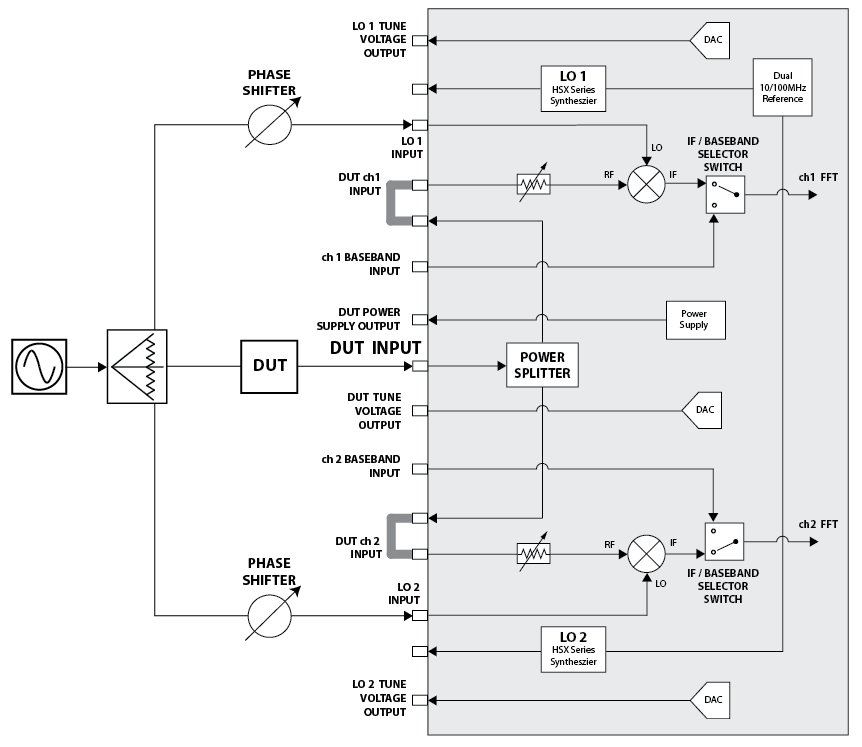兩個參考路徑則採用 HX5100 系列電子移相器,這些移相器具備特定頻率功能,可與 Holzworth 測試系統無縫整合,實現附加/殘餘相位雜訊量測的完全自動化;同時,這些移相器在量測過程中維持 ANSI z540 校準標準,確保量測結果的可靠性與可追溯性。