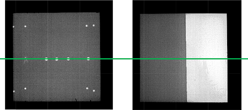 圖3:用於高發射率塗層測試的黑體紅外線影像。左側影像展示了一個表面佈有標準塗層並鑽有數個微型參考腔體的黑體;右側影像則展示了一個左半邊為標準塗層、右半邊為高發射率塗層的「雙面」黑體。圖中的綠色線條標示了圖4所示溫度分佈曲線的抽樣路徑。