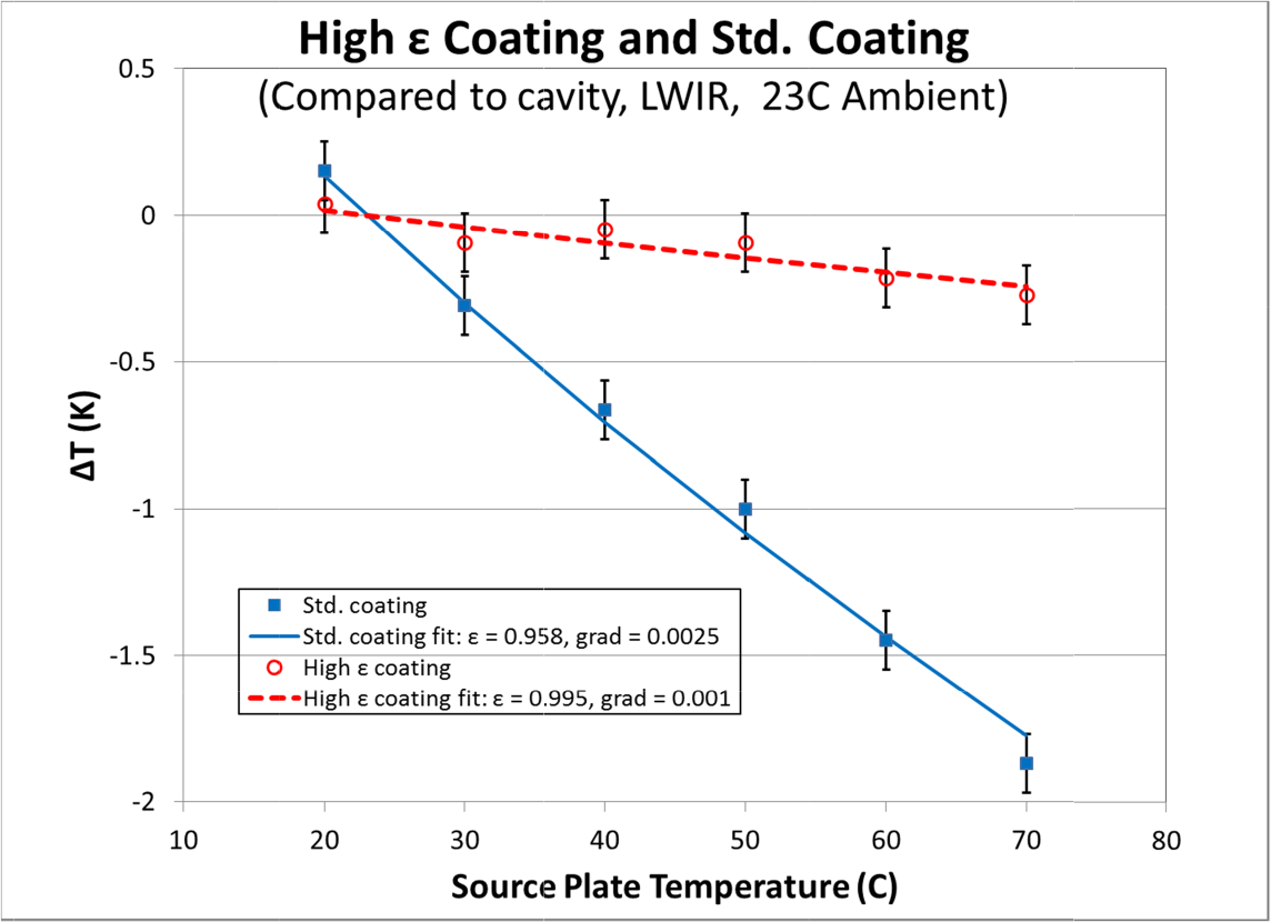 對於許多高靈敏度的紅外線系統而言,30mK可能已經是一個不可忽略的誤差值,在大多數常規應用中,這樣的誤差或許尚在可接受範圍內,但在低溫量測區間(此時黑體自身輻射較弱,環境反射的相對佔比較高)或者當需要量測與環境溫度差異極小的目標時(例如在MRT測試中),此誤差相對於期望的環境校正值而言就可能變得非常顯著;一個有效的改進方法是提高黑體表面的發射率,例如,若能將表面發射率提升至0.995,則上述因環境溫度估算誤差所引起的視在溫度誤差效應將會大幅降低約6倍,這將使得輻射量測結果對於環境條件及其變化的不完美認知具有更強的耐受性 (tolerable) 和穩定性。