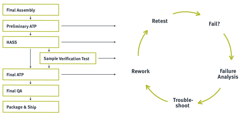 在最終組裝完成後,每個產品都需要通過自動化的初步接受測試程序(Preliminary ATP),若產品未能通過測試,則會進入失效分析(Failure Analysis)、故障排除(Troubleshooting)及重工(Rework)流程;若測試通過,則進一步進行 HASS 測試,以篩選出可能存在潛在問題的單元。