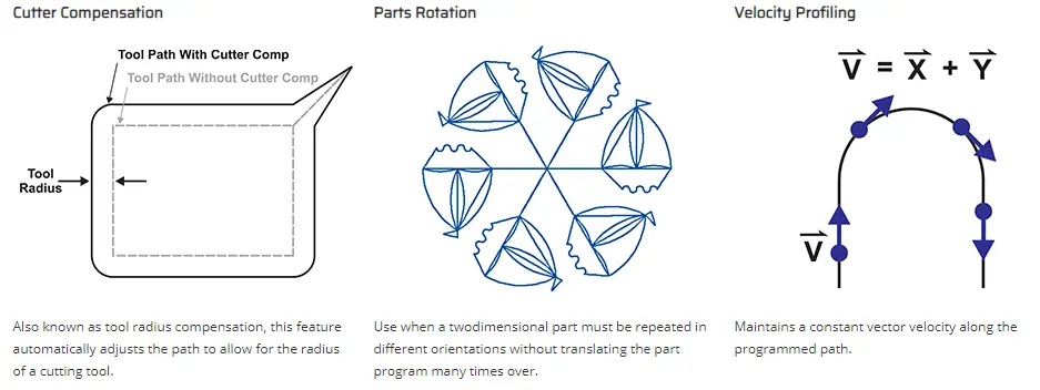 左至右為:刀具補償、零件旋轉、速度剖面控制。專為提升加工精度與簡化編程而設計。