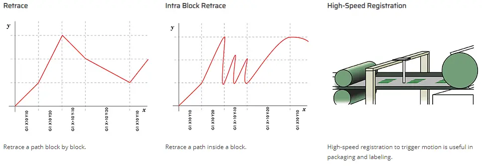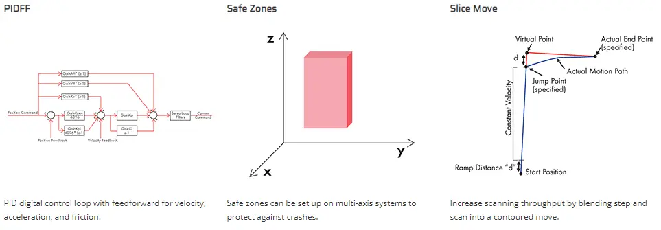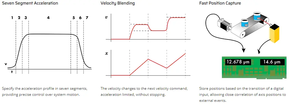 左至右為:七段式S曲線加減速、速度混合、高速位置捕捉。這些功能旨在實現更平順的運動與精確的事件同步。