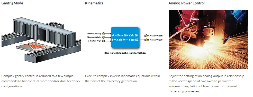左至右為:龍門模式、運動學轉換、類比功率控制,簡化複雜機械結構的控制,並與製程深度整合。