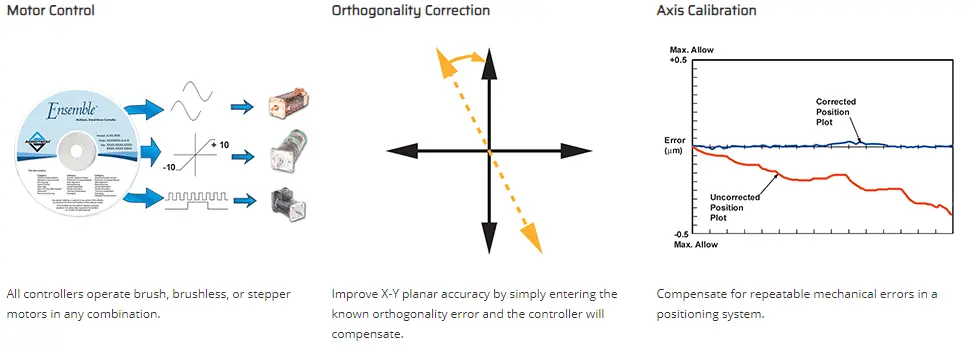 左至右為:多樣化的馬達控制、正交性補償、軸向校準。這些功能可修正機械上存在的系統性誤差。