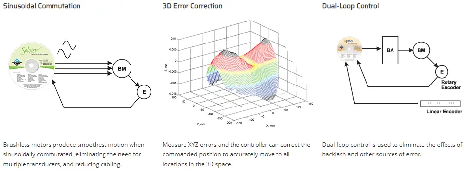 左至右為:正弦波換相、3D誤差補償曲面圖、雙迴路控制。實現極致平順的運動與最高等級的定位精度。