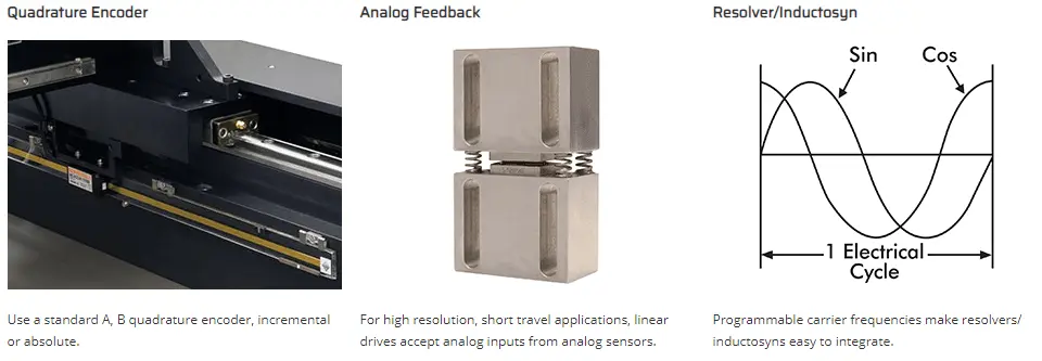 左至右為:標準正交編碼器、用於奈米定位的類比回授、堅固耐用的旋轉變壓器/感應同步尺。
