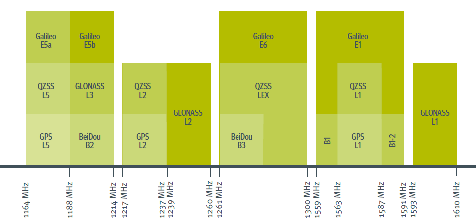 GNSS+IMU耦合系統中的GNSS部分需處理來自多個星座、多個頻段的複雜訊號(如圖所示的GPS L1/L2/L5, GLONASS L1/L2/L3, Galileo E1/E5a/E5b/E6, BeiDou B1/B2/B3等)。模擬器需要能準確再現這些訊號特性,而耦合演算法也需能有效融合這些多樣化的觀測數據。