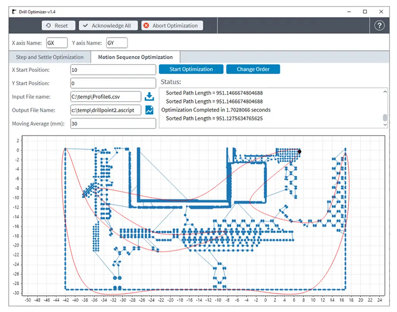 在運動序列最佳化過程中,DrillOptimizer 會收斂並找出最有效率的加工路徑,這個路徑涵蓋了單一掃描器視野 (FOV, Field of view) 內的所有待鑽孔圖案,或是透過 IFOV 技術結合掃描器的 FOV 與伺服平台系統進行加工,首先,使用者需輸入其特定的圖案,並提供起始點與終點位置以及移動方向等參數,最終的輸出結果會是一個簡化後的檔案,該檔案定義了掃描系統所需遵循的最高效率路徑,運動序列最佳化能夠處理超過一百萬個點位的圖案,並且僅需幾秒鐘即可完成計算,圖 2 展示了 DrillOptimizer 的操作介面,其中呈現了如前述所描述的最佳化後路徑。