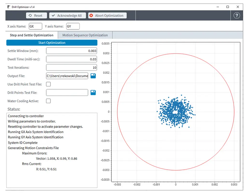 為達成此項效能,最佳化路徑中的每一次移動都需要一組專屬的調校參數,以便在不離開穩定區間的前提下,以最短的時間完成任何單次的移動,步進與穩定最佳化功能會根據使用者指定的穩定區間與每個鑽孔位置的雷射開啟時間作為輸入條件,以最佳化系統的振鏡硬體,並找出應使用的參數組合,此功能運用機器學習 (machine learning) 技術,收斂出最佳的參數組合,並將其輸出至 Automation1 控制器 以供使用,圖 3 描繪了步進與穩定最佳化的介面,其中包含了使用者輸入的參數,以及一個圖形化視窗,顯示用於訓練的移動所產生的峰值向量誤差。