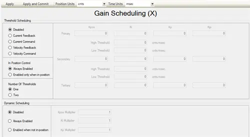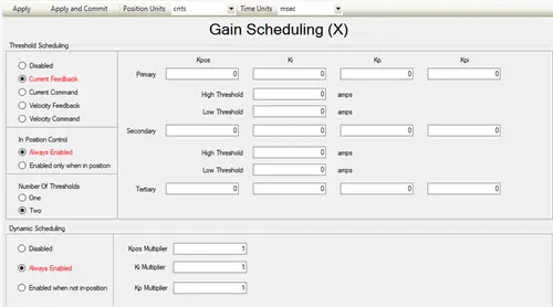 Aerotech 的閾值增益排程工具 (Threshold Gain Scheduling) 採用一種特殊演算法,透過依據使用者定義的特定閾值來調整伺服迴路增益,進而改善定位性能並縮短週期時間,當系統的運動狀態高於或低於設定的閾值時,增益便會自動調整,使用者最多可定義三組不同的增益等級。