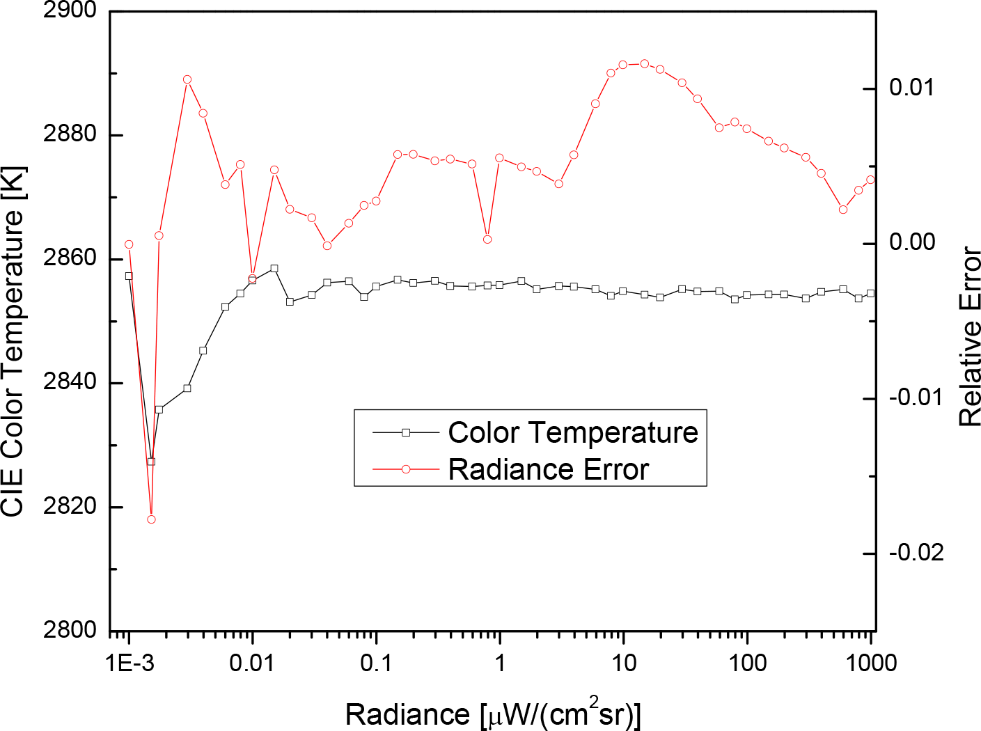 在圖 8 中所展示的 VEO-2 系統校正結果的具體案例中,我們所採用的光譜校正策略是經過權衡後,優先選擇了基於 CIE 色溫的穩定性與準確性作為主要的優化目標。圖 8 中同時清晰地展示了在採用這種特定校正策略之後,該 VEO-2 系統最終所能達到的實際色溫變異範圍,以及由此策略所導致的、在不同輸出亮度下的殘餘輻射亮度控制誤差。相關數據進一步表明,在未進行任何有效的光譜校正之前,VEO-2 系統在極低的亮度輸出水平,例如在 0.001 µW/(cm²sr) 時,其輻射亮度的控制誤差曾經一度超過了驚人的 10%。儘管從理論上講,透過進一步增加燈泡燈絲的加熱電流,有可能在一定程度上改善系統在極低亮度輸出時的輻射亮度準確度,例如,透過提升燈絲溫度來增加其在長波(近紅外)部分的相對輸出,以更好地匹配矽偵測器的光譜響應特性,但是,這樣做的直接後果將是使得系統在可見光波段計算出的 CIE 色溫顯著且不可接受地升高,從而嚴重偏離其設計的標準工作點。此外,一個不容忽視的實際限制是,對於任何以燈絲加熱發光為原理的燈泡而言,其能夠安全且持續承受的燈絲加熱電流量都存在一個明確的物理上限。一旦超過此上限,則可能導致燈絲溫度過高、鎢絲材料蒸發速率過快,甚至在極端情況下直接燒毀燈絲,從而對整個燈泡光源造成不可逆轉的永久性損壞。