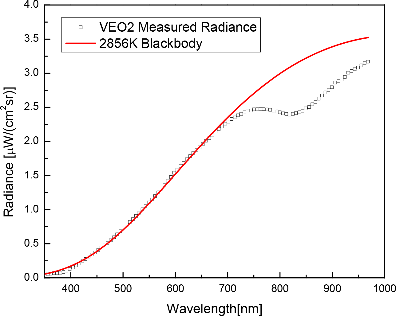 圖 6 VEO-2 光譜與 2856 K 黑體之比較,850 nm 附近的凹陷是由於準直儀反射鏡鍍膜的吸收所造成。