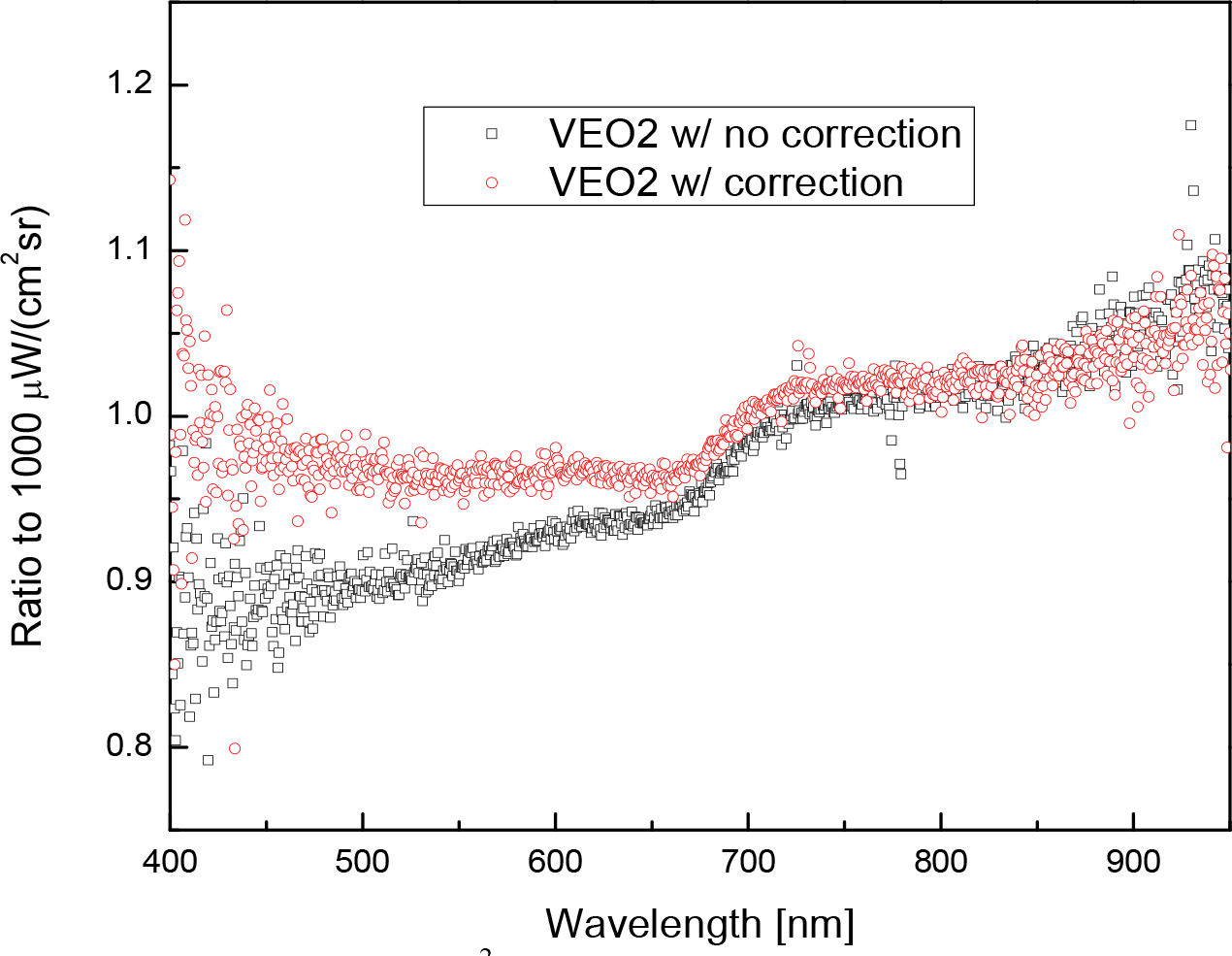 圖 9. VEO-2 在 0.01 µW/(cm²sr) 時的比較,上圖顯示 VEO-2 在 1000 µW/(cm²sr) 與 0.01 µW/(cm²sr) 之間光譜在校正前後的比例,相較之下,圖 3 中的 VSX 資料表現相當良好,VEO-2 的資料在 675 nm 附近顯示一個光譜特徵,這限制了燈絲電流校正的有效性。