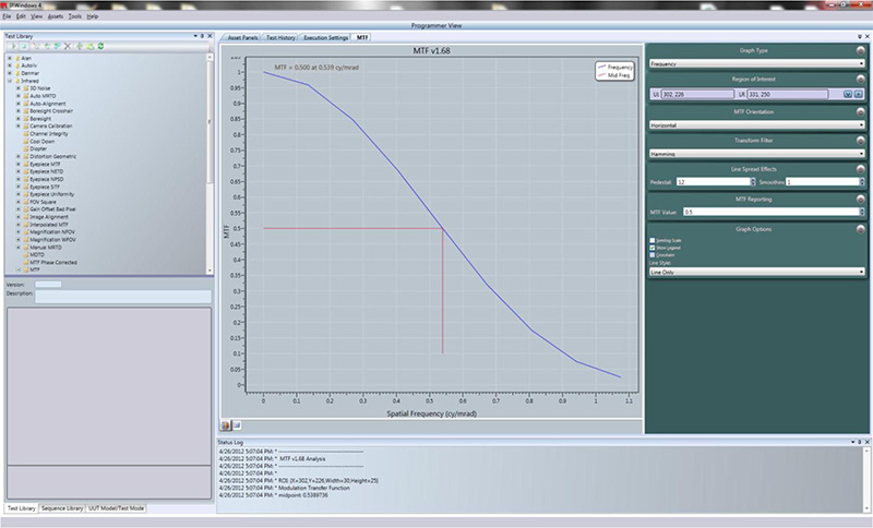 調變轉換函數 (MTF),作為一項評估成像系統清晰度的關鍵指標,常被用於尋找紅外成像系統的最佳聚焦位置,IRWindows 平台允許開發者在測試過程中即時檢視所擷取的影像,並能精細地調整計算 MTF 時所使用的關注區域,以及如平均幀數、影像濾波等其他相關參數,以便獲得最能反映系統真實性能的 MTF 值,此外,IRWindows 還特別提供了一個連續模式功能,在該模式下,操作員可以即時調整 UUT 的參數(例如:鏡頭的聚焦),並同步觀察 MTF 值的變化,從而迅速將系統調至最佳狀態以最大化 MTF 值,相較於傳統僅能透過簡單文字輸入進行參數調整的方式,這種互動式的操作顯著縮短了測試開發的時間,同時,TPS 開發者也可以選擇將此便捷的連續模式整合進最終的 TPS 中,使得現場操作員能夠在 TPS 實際運行過程中,先將系統手動調整至最佳聚焦狀態,然後再執行一次標準的 MTF 測試以擷取並記錄最終的精確結果。