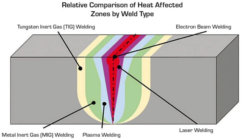 圖 2 - 雷射焊接的熱影響區與其他材料接合形式的比較圖示。