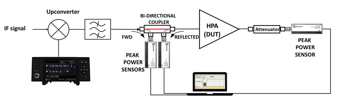 圖 5 展示了使用 Boonton SGX1000 訊號產生器作為 LO 替代方案的典型配置,並搭配 Boonton RTP5000 峰值功率感測器,對升頻轉換鏈路中的高功率放大器 (High-Power Amplifier, HPA) 進行精準的功率與效能評估。
