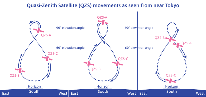 此圖表展示了日本準天頂衛星系統(Quasi-Zenith Satellite, QZS)中,多顆衛星(如QZS-A, QZS-B, QZS-C)在天空中的視運動軌跡。(圖片來源:QZSS)