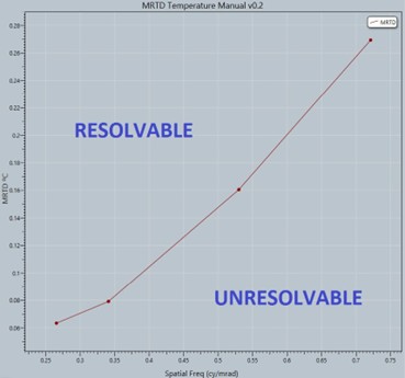 最小可解析溫差 (MRTD) 測試是評估紅外線成像系統性能時,通常需要進行的關鍵測試之一,此測試綜合了系統的靈敏度與解析度量測,其最終目標是繪製一條曲線,該曲線表示觀察者能夠解析出特定空間頻率 (spatial frequency) 的目標時,所需的最小溫差。這條MRTD曲線將溫度與空間頻率的二維空間劃分為兩個區域:觀察者能夠解析目標影像的區域,以及無法解析的區域(如圖1所示)。
