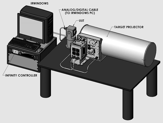 至於作為本次研究核心的待測物 (UUT),我們選用了一台由IR Cameras 生產的 IRC912 型紅外線攝影機,這是一款採用閉循環史特林致冷器 (closed cycle cooler) 的高性能中波紅外攝影機(奧創系統亦提供 紅外線攝影機 (IR Cameras) 以供客戶搭配),其核心感光元件是一個具有 1280x1024 像素解析度的 nBn 型焦平面陣列 (Focal Plane Array, FPA);該攝影機配備了一個焦距為 25 mm 的紅外鏡頭,在此光學配置下,經過計算,系統的有效奈奎斯特頻率 (Nyquist frequency)(即理論上能無混疊地解析出的最高空間頻率)約為 1.042 cyc/mrad。由於此款IRC912攝影機本身並未內建整合式的顯示螢幕,因此,在測試過程中,從攝影機數位擷取到的即時紅外線影像,會透過 IRWindows 測試軟體內建的影像檢視器功能,以正常的即時幀率(例如30Hz或60Hz)完整地顯示在主控電腦的高解析度螢幕上,供參與測試的觀察者進行即時的目標判讀。為了確保影像數據傳輸的穩定性與即時性,該攝影機採用了高速的 GigE 通訊介面與主控電腦連接,並且該GigE通道被專門指派給一個獨立的專用網路卡,這樣的配置可以最大限度地減少任何潛在的因網路擁塞或系統資源衝突可能導致的攝影機影像傳輸延遲,確保觀察者看到的影像是即時且流暢的。