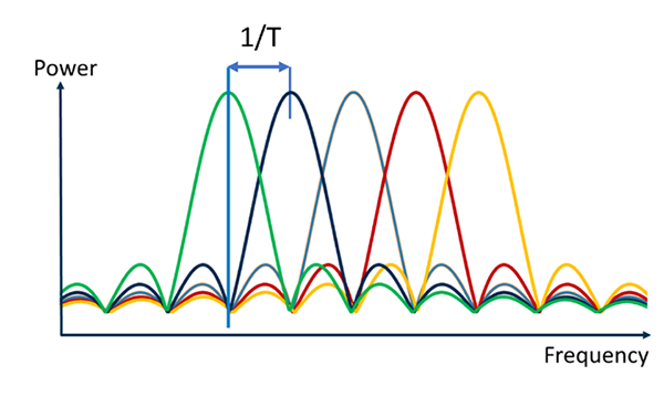 OFDM 的實現方式是採用多個子載波,其正交性來自於子載波間的間隔等於符元時間(T)的倒數,如圖 1 所示,以 Wi-Fi 6 為例,其符元時間為 12.8 μs,子載波間距即為其倒數 78.125 kHz,這樣的間距設計能讓每個子載波的峰值對齊其他子載波的零點,進而避免子載波間的干擾。