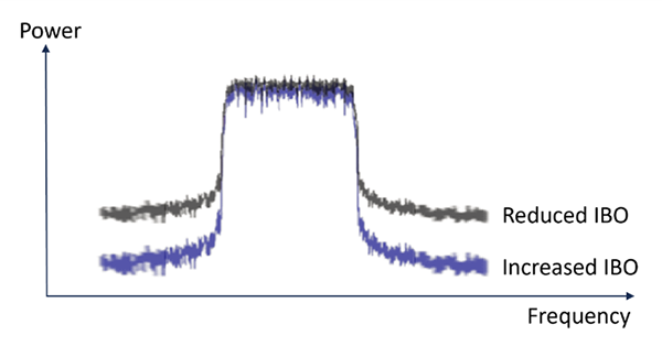 業界可以利用輸入功率補償(IBO,Input Back-Off)來降低訊號峰值,使其操作受限於線性區內,如圖 4 中的藍色部分所示,然而,這種做法同時會降低平均功率,讓放大器無法在其最高效率的理想點運作,同樣如圖 4 所示。