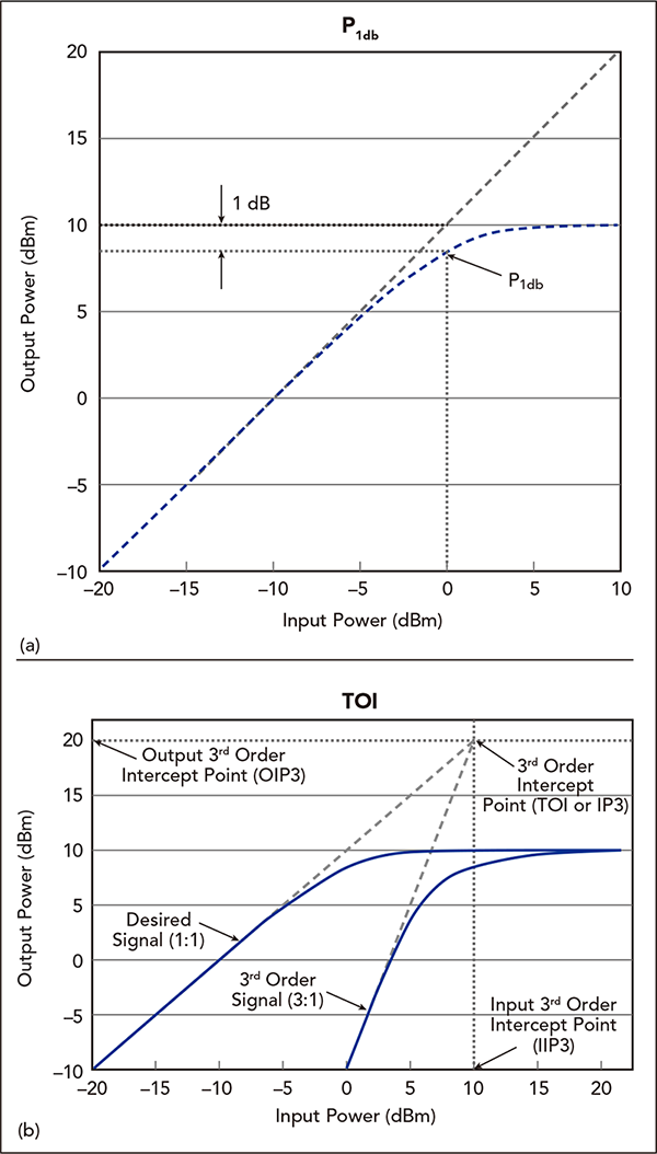過去,業界使用數種方法來描述線性度,其中兩種常見的方法是量測 1 dB 壓縮點(P1dB)或三階交會點(TOI),如圖 6 所示。