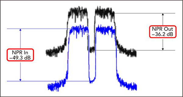 雜訊功率比(NPR)量測則使用頻寬限制的加成性高斯白雜訊(AWGN),並搭配一個濾波器,在雜訊頻段中央產生一個凹口以降低該處的雜訊功率密度,當放大器被驅動至更深的非線性區時,頻譜再生現象會更明顯地填補這個凹口,如圖 7 所示,此方法能非常有效地呈現由放大器非線性所引起的頻譜再生如何導致相鄰通道洩漏,雖然使用 AWGN 的 NPR 量測更能反映真實世界的性能,但它仍需要昂貴的測試設備,且量測過程可能相當耗時。