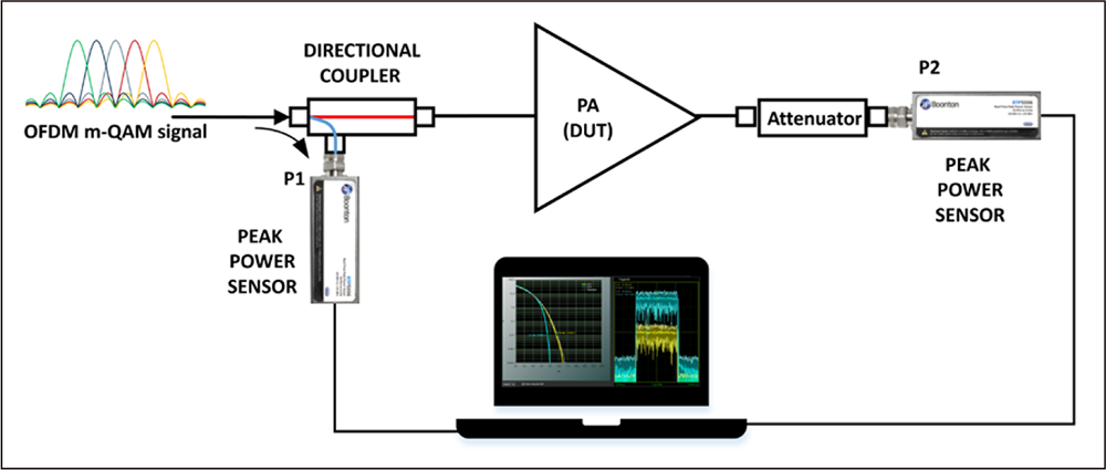 透過使用峰值功率感測器和 CCDF 圖,當調整輸入功率補償或其他放大器參數以尋找放大器線性曲線上的最佳操作點時,可以獲得即時的快速量測結果,這個最佳點就是達到最低可接受 PAPR、進而達到最高可接受 EVM 的點,之後,在生產測試中,放大器製造商僅需監控 PAPR 的變化,而無需量測 EVM。