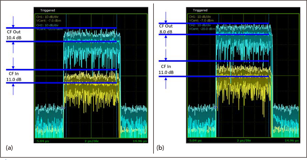 量測結果顯示於圖 10a 與 10b,圖 10a 顯示當放大器在其線性區頂部附近運作時,輸入訊號(CH1)與輸出訊號(CH2)的最大 PAPR 值(即波峰因數,Crest Factor),從圖中可觀察到,輸出的波峰因數比輸入訊號低約 0.6 dB,顯示出輕微的峰值壓縮,而圖 10b 則顯示降低輸入功率補償後的情況,此時放大器被進一步推入壓縮區運作,在這種情況下,波峰因數降低了 3 dB,這可能導致 EVM 增加並引發符元錯誤。