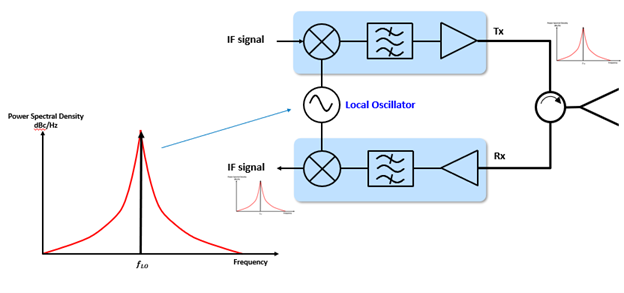 下方顯示一個簡化的雷達系統方塊圖,相位雜訊的潛在主要來源是本地振盪器 (LO, Local Oscillator) 和放大器,下圖說明相位雜訊將如何影響雷達系統本身,LO 使中頻 (IF, Intermediate Frequency) 訊號(可能經過調變)能夠升頻轉換至最終發射的微波頻率,同一個 LO 也使接收到的微波訊號能夠降頻轉換至 IF,以便對接收到的訊號進行數位化和處理,理想情況下,LO 會在單一頻率產生離散的連續波 (CW, Continuous Wave) 音頻,然而,實際上 LO 訊號並不完美,包含相位雜訊等缺陷,如圖中紅色標示的頻譜元素所示。