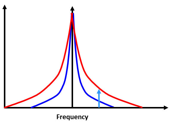 雷達系統會因相位雜訊效能不佳而受到嚴重影響(接收器靈敏度降低),因為元件的相位雜訊可能會遮蔽返回的雷達特徵,為說明這一點,請參考下圖,深藍色代表低相位雜訊的 LO,淺藍色代表降頻轉換後的雷達回波,使用具有較高相位雜訊的 LO(紅色標示)時,我們可以看到不良的相位雜訊效能將如何遮蔽較小的雷達回波訊號。