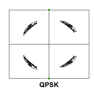 下方是一個 QPSK 訊號,其帶有一些相位雜訊導致訊號擴散,但每個符元仍可準確解碼,在此範例中,LO 的相位雜訊效能不會影響訊號的符元錯誤率 (SER, Symbol Error Rate)。