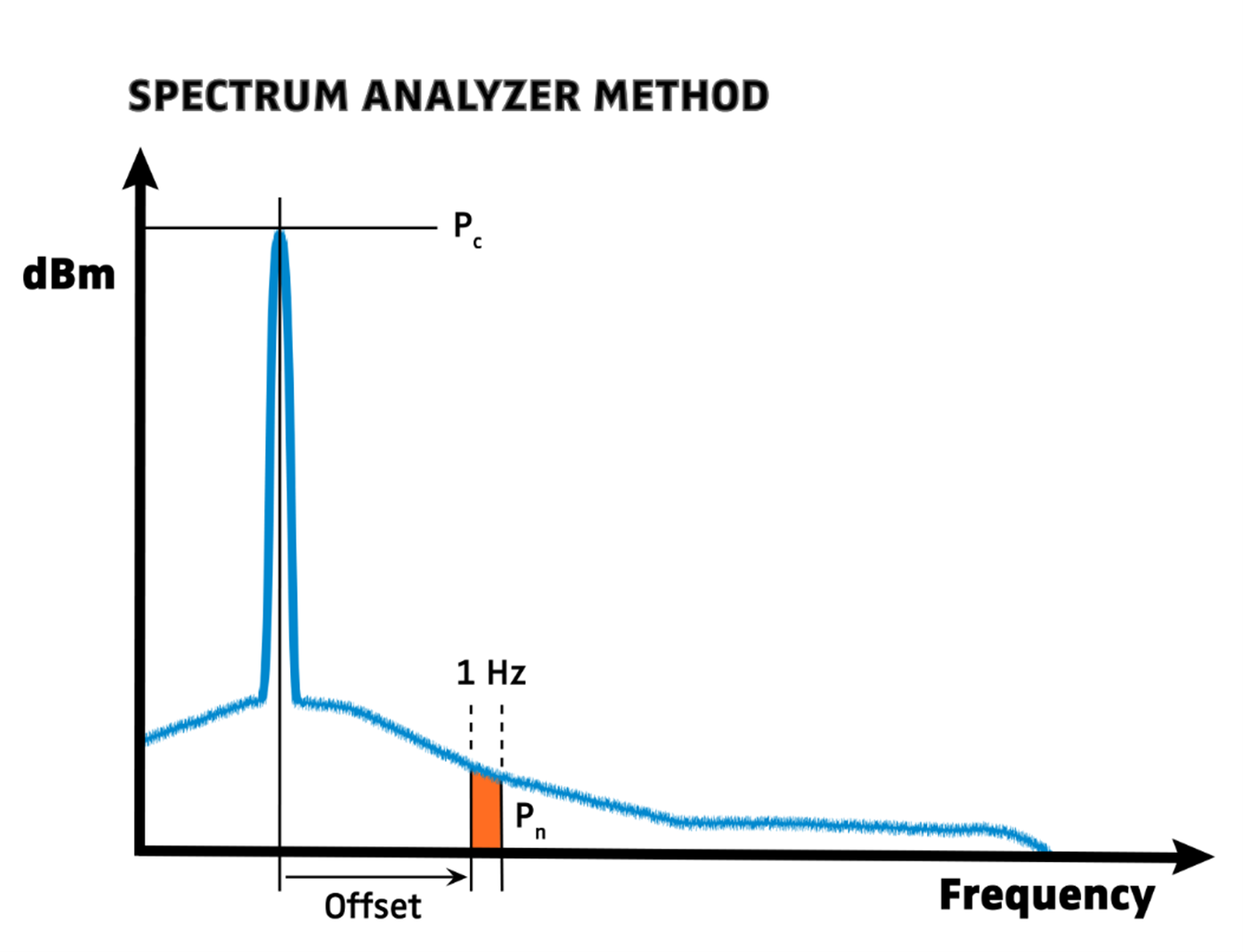 相位雜訊量測最初是使用頻譜分析儀進行的,若要在頻譜分析儀上執行此量測,儀器會擷取訊號的完整頻譜,然而,由於相位雜訊是對稱的,因此只需要頻譜的其中一側,這稱為單旁波帶 (SSB, Single Sideband) 相位雜訊量測,頻譜分析儀使用特定的解析度頻寬 (RBW, Resolution Bandwidth) 擷取頻譜,此 RBW 在不同頻譜分析儀之間可能有所不同,為了在不同頻譜分析儀之間標準化量測結果,量測值會參考載波訊號 (dBc) ,並將功率頻譜密度轉換為 1Hz 頻寬,這就產生了相位雜訊的單位:dBc/Hz。