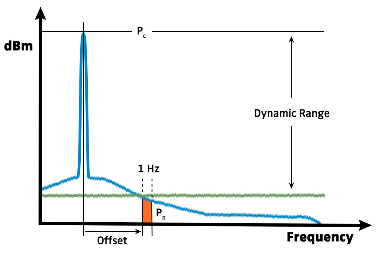 為了能夠將一個相位雜訊量測與另一個進行比較,可以包含一個相對於載波的特定頻率偏移,已知的偏移量使得量測在不同待測物 (DUT, Device-Under-Test) 之間具有可重複性,下圖展示如何使用此方法量測相位雜訊;圖中橘色部分顯示了在此範例中理想的相位雜訊量測區域。