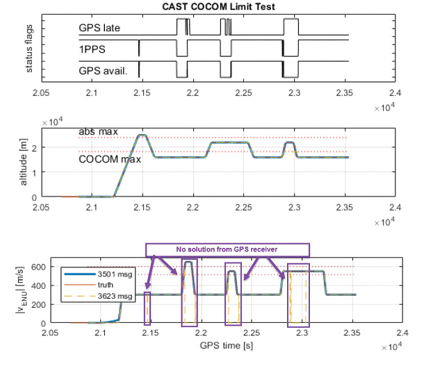 透過HIL測試,研發工程師可以在產品設計的早期階段就發現潛在的軟硬體缺陷、演算法問題以及系統整合風險,例如下圖所示的GNSS訊號中斷時的系統反應,以及在COCOM(美國出口管制條例)動態限制下的PNT輸出行為,都可以在HIL環境中安全、精確且可重複地進行驗證,從而大幅縮短研發週期,降低昂貴且耗時的外場測試需求。
