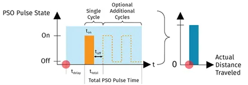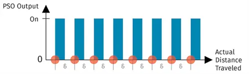 固定距離 PSO 脈衝是 PSO 最常見的應用情境,這是因為以位置回饋為觸發依據,是確保如雷射觸發或資料擷取等關鍵製程控制,能準確發生在您預期位置上的最精確方式,在此模式下: