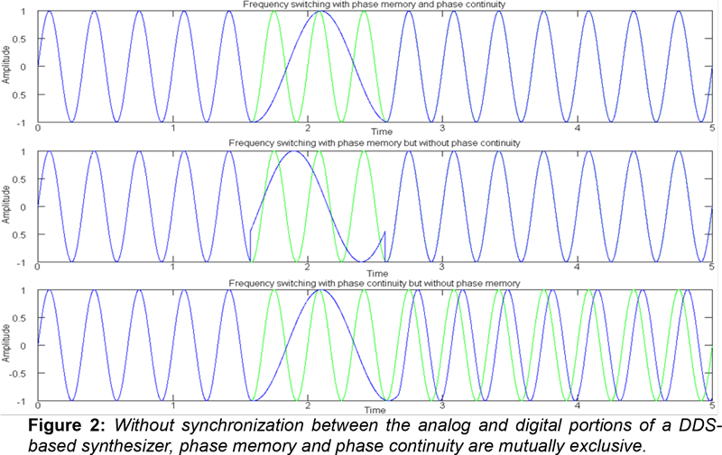 - 在此範例中,合成器訊號(藍色曲線)經過頻率切換後,雖然回到原始頻率時仍保有相位記憶,但未能保持相位連續性,即頻率變化過程中發生了相位突變(phase jumps)。