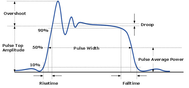 一個脈衝週期內的平均功率位準,Average Power = Peak Power * Duty Cycle (對於理想方波脈衝而言)。 - 過衝 (Overshoot):