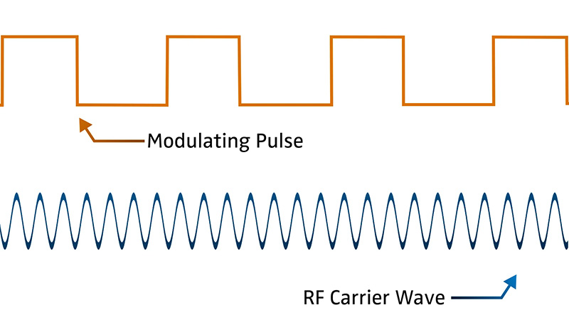 此圖解說了脈衝調變的兩個基本組成部分,上方為數位化的「調變脈衝」,其方波形式決定了訊號的開關時序;下方則是連續波(CW)形式的「射頻載波」,它將被脈衝所調變,以承載最終要傳遞的資訊。