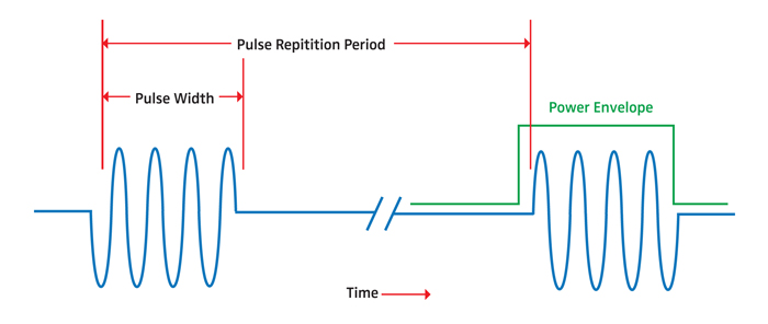 航空使用的主要監測雷達採用脈衝調變的正弦載波訊號,此類雷達的輸出訊號包含短促的脈衝串,其功率封包具有快速上升時間,以便以足夠的解析度分辨遠處目標(見圖一),短持續時間的脈衝實現了精確的「目標」解析,而脈衝間的長間隔則為遠處訊號的回波返回提供充足時間,避免干擾後續脈衝,這些高功率脈衝訊號的上升時間可能小於 10 ns,脈衝寬度則在 µs 與次 µs 範圍內,這些低佔空比訊號(通常遠小於 1%)會產生顯著的峰值平均功率比,或稱波峰因數,這使得傳統熱感測器難以進行精確功率量測,需要使用具備寬動態範圍的峰值功率感測器來量測發射脈衝的功率(見圖二),因此,雷達訊號需要較高的系統訊噪比 (SNR),才能準確地定位和識別目標。