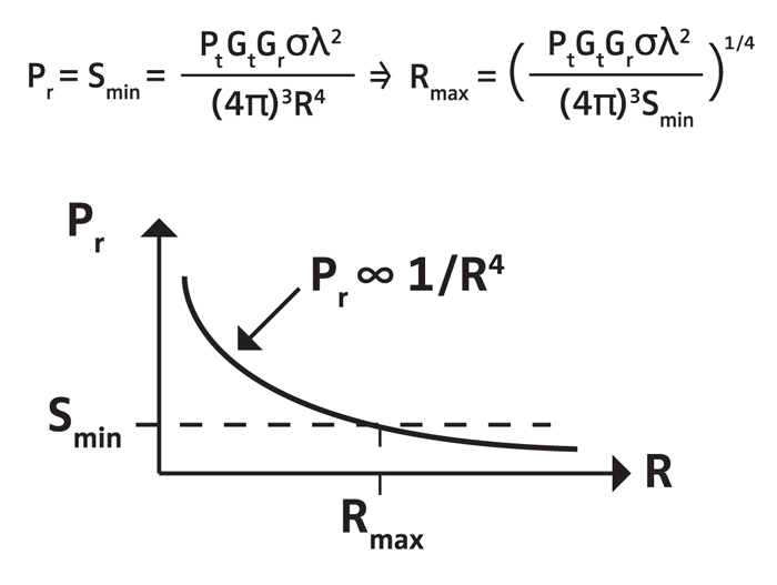 圖四、呈現了接收功率 (Pr) 與雷達距離 (R) 之間的關係,公式顯示 Pr 與發射功率 (Pt)、天線增益 (Gt, Gr)、雷達截面積 (σ) 和波長 (λ) 成正比,但與距離的四次方 (R⁴) 成反比;圖下方曲線直觀地展示了隨著距離增加,接收功率迅速下降的趨勢,並在達到最大偵測距離 (Rmax) 時接近最小可偵測訊號 (Smin);此圖強調了雷達偵測範圍受到距離衰減的顯著影響。