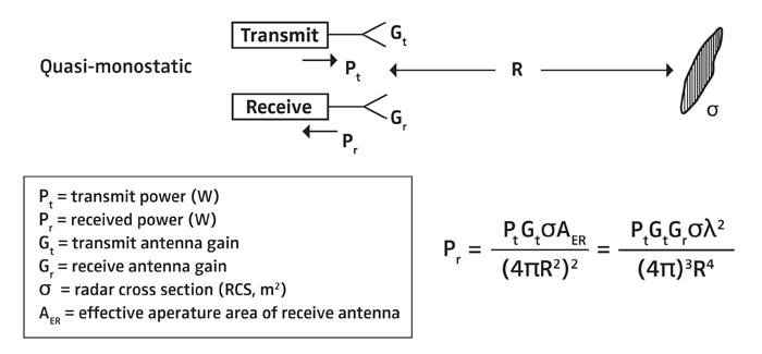 圖五、此圖描繪了準單站雷達系統的接收功率 (Pr) 計算模型;展示了發射天線 (Transmit) 發出功率為 Pt 的訊號,經過距離 R 傳播後被目標 (σ) 反射,再由接收天線 (Receive) 接收功率為 Pr 的回波訊號;圖下方提供了 Pr 的兩種計算公式,分別考慮了接收天線的有效孔徑 (AER) 和雷達截面積 (σ) 與波長 (λ);公式和圖示說明了接收功率受到發射功率、天線增益 (Gt, Gr)、目標特性和傳播距離等多個因素的影響。