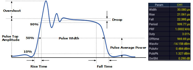 以二極體為基礎的射頻峰值功率感測器,其設計特點是在平滑電容兩端使用低阻抗負載,這樣的配置使得電容在射頻振幅下降時能夠迅速放電;這種快速放電的特性,再結合非常小的平滑電容值,使得峰值功率感測器得以實現極快的上升時間。目前,在功率量測儀器領域,最先進的上升時間已可達到 3 奈秒 (ns),如此高速的反應能力有助於對封包功率以及其他關鍵指標進行可靠且精確的追蹤,從而滿足先進雷達系統不斷演進且日趨複雜的應用需求。為了進一步簡化儀器使用者的操作流程,許多現代的射頻功率計與感測器均提供自動化脈衝量測功能,這些功能可自動計算並顯示一系列重要參數,例如:脈衝寬度、上升時間、下降時間、週期、脈衝重複頻率 (PRF)、工作週期、關閉時間、波形平均功率、脈衝平均功率、脈衝峰值功率、過衝、脈衝頂部下降 (droop)、脈衝頂部功率、脈衝底部功率以及邊緣延遲(參見圖 1),讓使用者能更便捷地獲取詳細的脈衝特性資訊。
