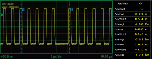 DME/DVOR 系統中脈衝之間的間隔是經過精密設計的,維持此一特定間隔對於系統的正常運作至關重要,因此,能夠精確地量測脈衝時序就顯得極為關鍵。擁有卓越的時間解析度——目前功率量測儀器在此方面最先進的技術已達到 100 皮秒 (ps)——不僅能夠有效地確認脈衝之間是否維持正確的間隔,還能夠實現更為穩定的觸發機制,並且能揭示出一些原本可能因為解析度不足而被掩蓋的微小波形細微差異。