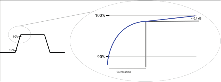 圖 2:脈衝垂直穩定時間的放大檢視圖,呈現了訊號的穩定時間(從 90% 變化至其最大值的 0.1 dB 範圍內),完整的響應時間 = 上升時間 + 穩定時間。