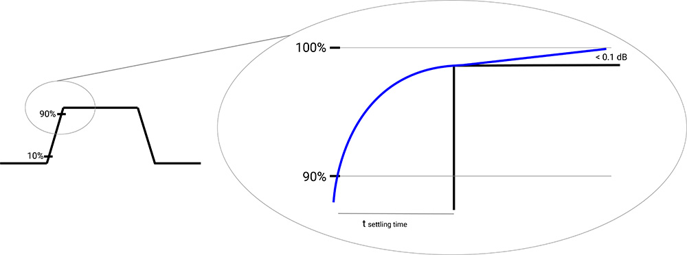 圖 1:脈衝垂直穩定時間的放大視圖,訊號的穩定時間(從 90% 到距離其最大值小於 0.1 dB),反應時間 = 上升時間 + 穩定時間。