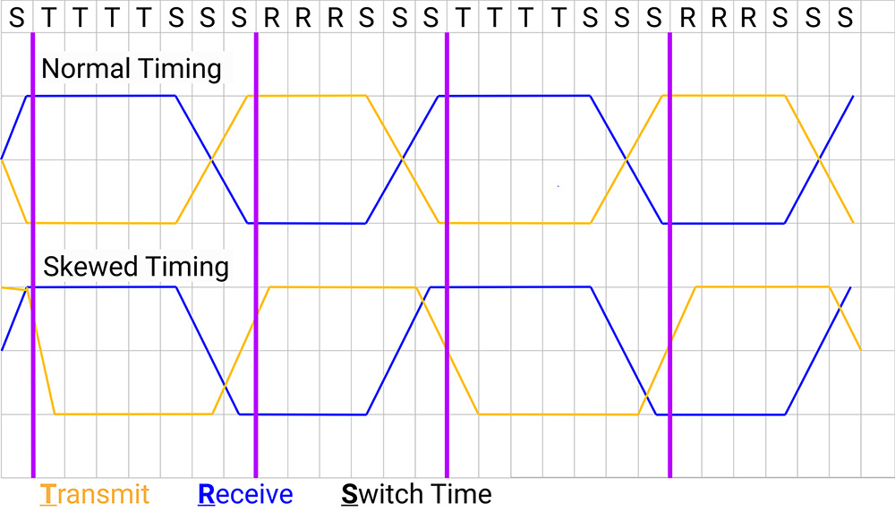 圖 2:理想的 TDD 交換器時序展現極高的精確度,切換在發射(黃色)和接收(藍色)操作之間的延遲幀內均勻發生,由傳播延遲等因素引起的時序偏斜,可能導致切換重疊和前導資料錯誤等挑戰,進而降低 TDD 傳輸的完整性。