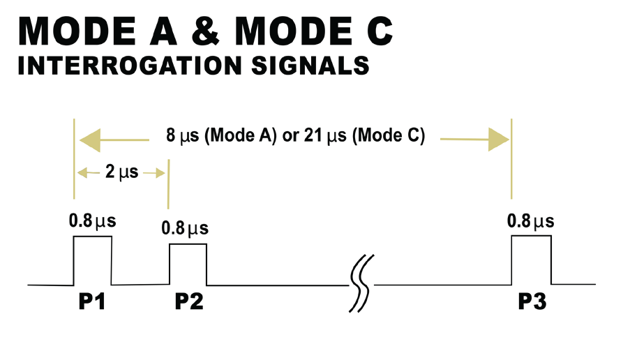 SSR 天線能夠發射不同種類的詢問訊號,以引導飛機做出特定的回應,這些詢問訊號依其模式進行分類;例如,模式 A 用於請求目標的識別碼模式 C 與其相似,主要由地面站用來請求以 100 英尺為單位遞增的飛機高度,模式 S 則更為複雜,因為它能向目標請求多樣化的資訊,除了脈衝之外,此模式的詢問訊號還包含一個相位調變資料區塊;圖 2 與圖 3 說明了模式 A、C 和 S 詢問訊號之間的差異。